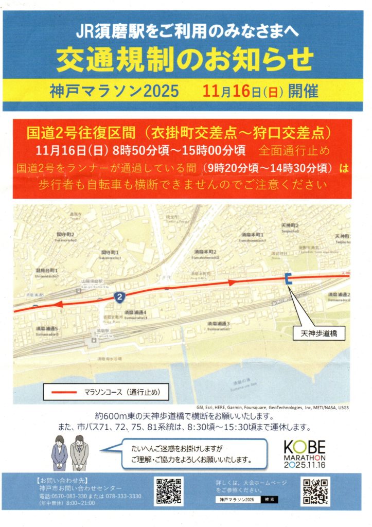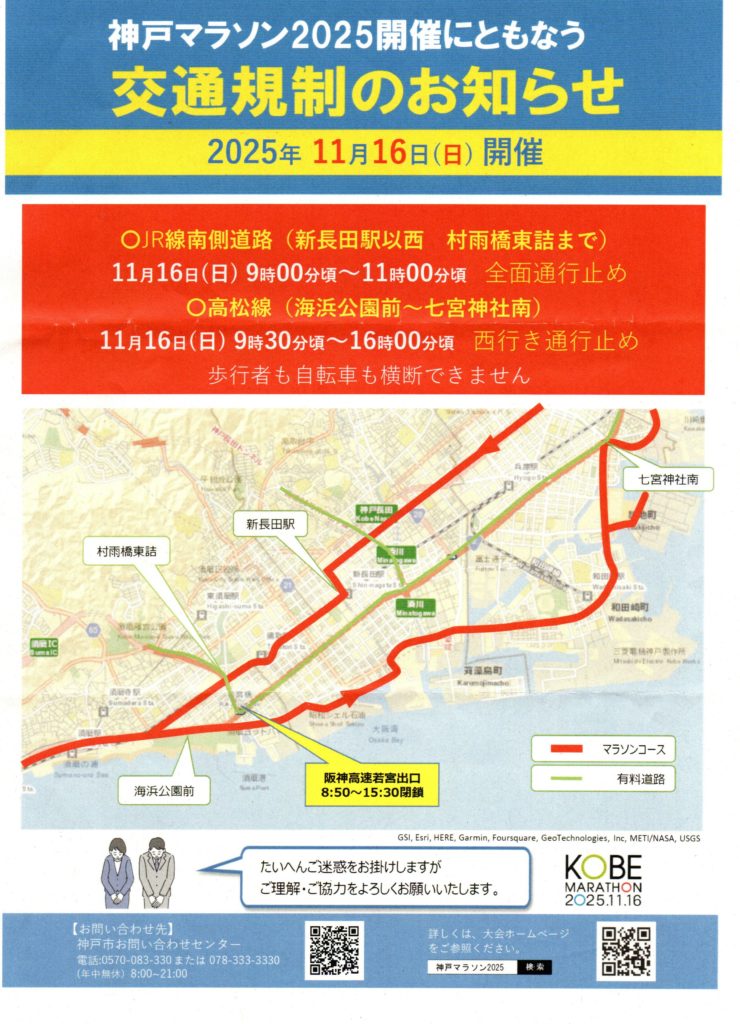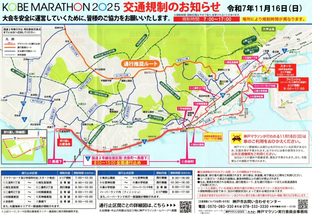 KOBE MARATHON 2025。神戸マラソン開催に伴い大規模な交通規制が行われます。神戸マラソンが行われる11月16日(日曜)は車のご利用をおひかえください。コース変更により、昨年と規制時間が変更になっている区間・エリアがあります。(関守町2丁目自治会より提供)